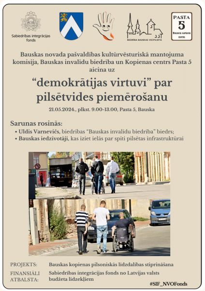 Bauskas kopienas centrā «Pasta 5» 2024. gada 21. jūniijā aizvadījām Demokrātijas virtuves pasākumu par tēmu: «Iekļaujoša, droša un aktīva pilsētvide personām ar invaliditāti, ģimenēm ar bērniem, sabiedrības līdzdalības piemēri.»